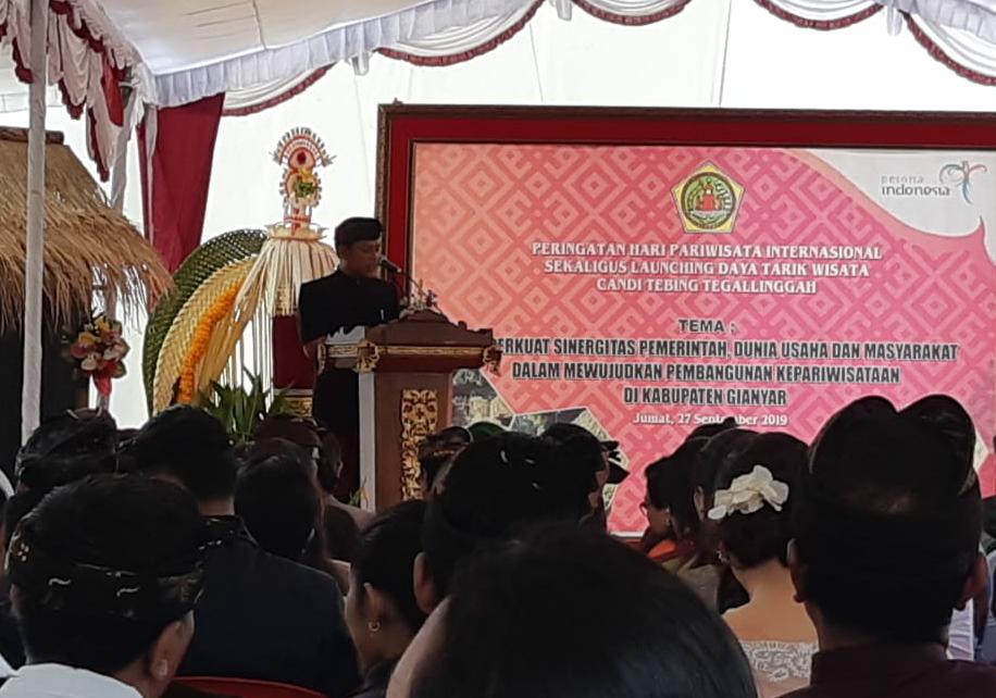 TARGETNUSA Gianyar Bali – Kegiatan peringatan hari pariwisata internasional sekaligus launching daya tarik wisata candi tebing tegallinggah dgn tema ” Memperkuat sinergitas pemerintah, dunia usaha dan masyarakat dalam mewujudkan pembangunan kepariwisataan di kabupaten Gianyar ” di Area Parkir Obyek Wisata Candi Tebing Tegallinggah, Banjar Tegallinggah Desa Bedulu Kecamatan Blahbatuh Kabupaten Gianyar-Bali, Jum’at (27/9).