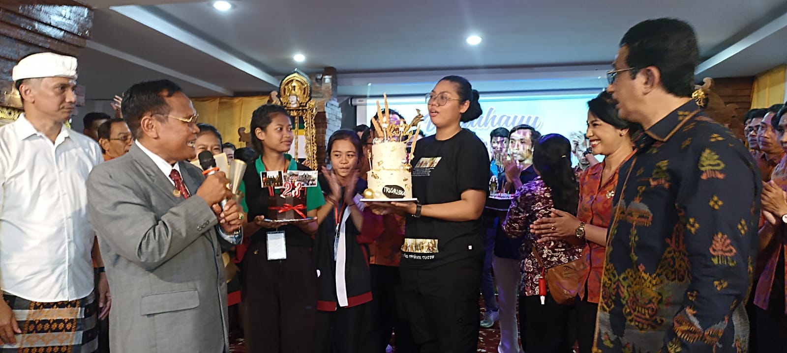 HUT Ke-23 SMK PGRI 3 Denpasar bertemakan Mewujudkan Sekolah yang Berkualitas, Nyaman dan Berkarakter ditandai dengan pemotongan tumpeng.