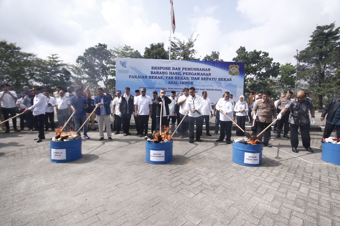 Termasuk dalam hal ini kegiatan yang dipimpin langsung Menteri Perdagangan Zulkifli Hasan Yang memusnahkan 730 bal pakaian, sepatu, dan tas bekas yang diduga asal impor senilai kurang lebih Rp10 miliar di Terminal Tipe A Bandar Raya Payung Sekaki Pekanbaru, Riau pada hari ini.