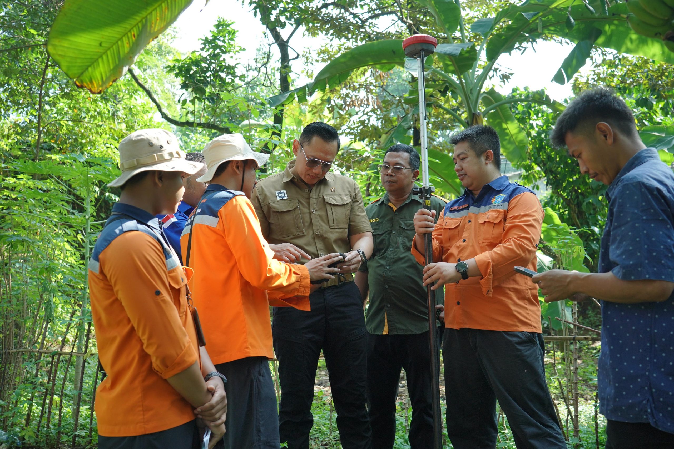 Menteri Agraria dan Tata Ruang/ Kepala Badan Pertanahan Nasional (ATR/BPN) Agus Harimurti Yudhoyono (AHY) menyaksikan langsung pengukuran tanah milik warga Depok. Pengukuran ini berlangsung di Kelurahan Cimpaeun, Kecamatan Tapos pada Kamis (06/06/2024).