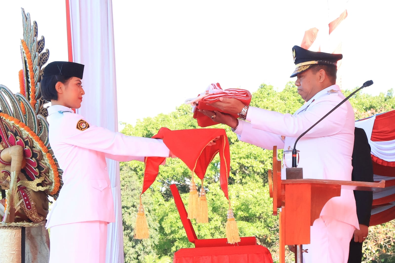 Dalam upacara tersebut, pengibaran bendera merah putih dilakukan oleh I Made Axel Bhagaskara Prawira (Denpasar), Gede Bagus Satrya Wibawa (Klungkung), dan I Wayan Ananta Wijaya (Karangasem). Ni Komang Femi Dinanti Sapit (Jembrana) bertugas sebagai pembawa baki, sementara Komandan Pasukan diemban oleh Lettu Inf. Virca Berly P. dari Yonif 900/SBW. (Red/TN)