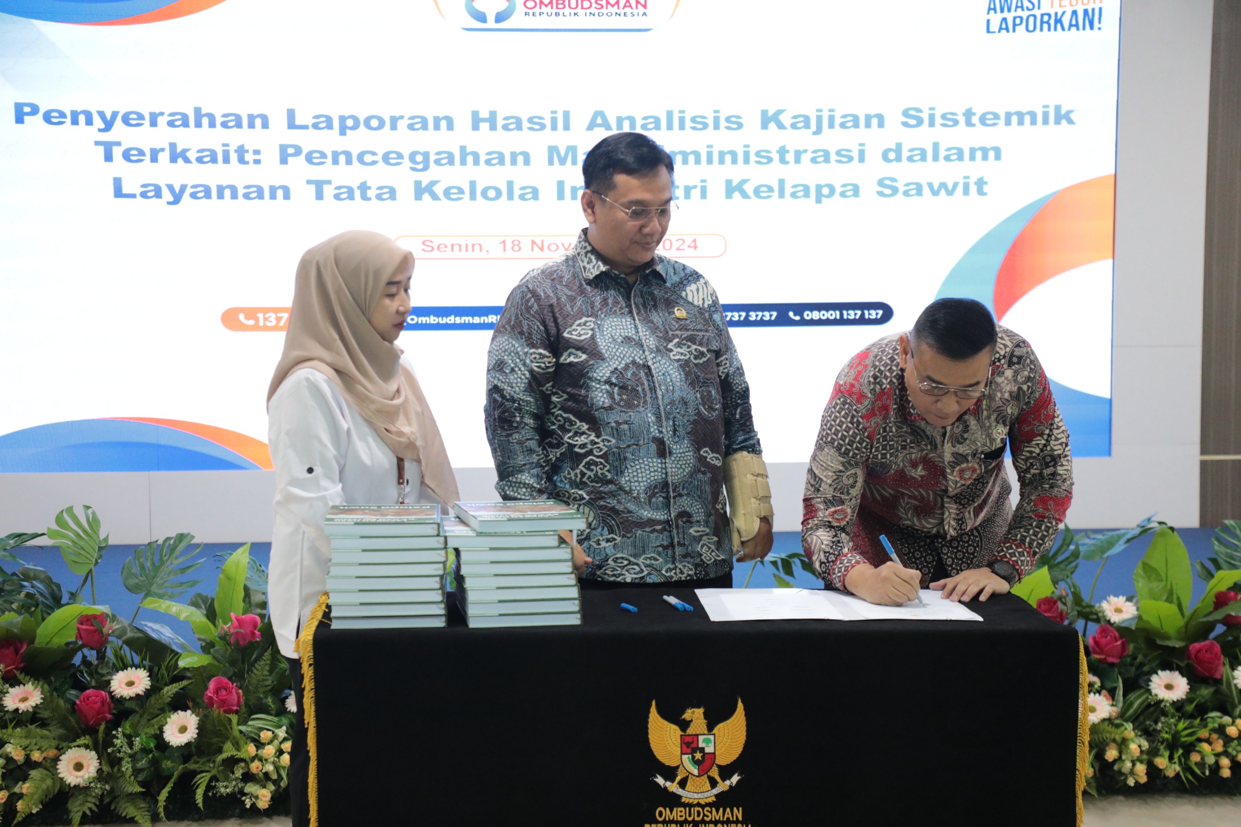 Menteri Agraria dan Tata Ruang/Kepala Badan Pertanahan Nasional (ATR/BPN) yang dalam hal ini diwakili Ossy Dermawan selaku Wakil Menteri (Wamen) ATR/Wakil Kepala (Waka) BPN menerima Laporan Hasil Kajian Sistemik tentang Pencegahan Maladministrasi dalam Layanan Tata Kelola Industri Kelapa Sawit dari Ombudsman Republik Indonesia (ORI), Senin (18/11/2024).