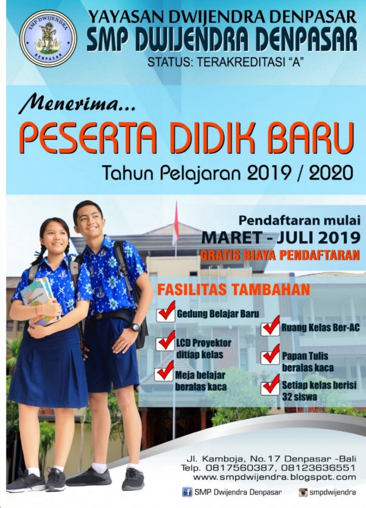Terkait target penerimaan siswa baru dalam PPDB 2019/2020, SMP Dwijendra menargetkan akan menerima 10 kelas dan per-rombel 32 siswa. Dan SMP Dwijendra akan menyelenggarakan promosi dengan mendatangkan 2500 siswa di sekolah yang terletak di Jalan Kamboja Pasar Kreneng Kota Denpasar ini. (Ash)