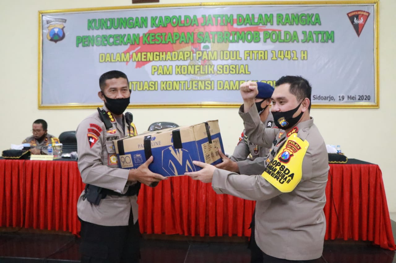 Dengan didampingi Wakapolda Jatim dan bebarapa Pejabat Utama Polda Jatim,kunjungan kerja ke Satbrimob di Taman Sidoarjo ( Selasa 19/5/20 ) ini Kapolda Jatim memberikan arahan bahwa diharapkan anggota Brimob harus benar – benar menjaga kesehatan.