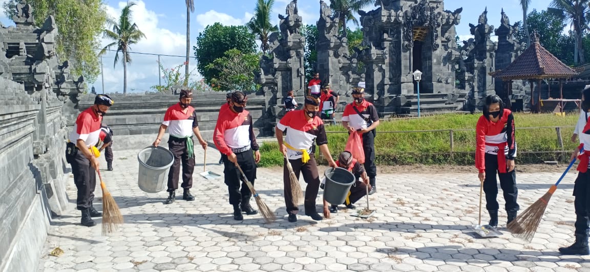 Selesai melaksakan apel seluruh personil yang melaksanakan kerja bakti di Pura Bias Muntig. Kabag Ren, Kasat Sabhara dan Kapolsek serta personil menyapu ada yang mencabut rumput, mengangkut sampah serta membuangnya ke tempat yang sudah disediakan dan dibakar. Setelah melaksanakan kerja bakti yang dipimpin Kabagren, Kasat Sabhara Polres Klungkung, Kapolsek menyerahkan sembako berupa beras dan minyak goreng yang merupakan bantuan dari Polri dilaksanakan di depan Pura Bias Muntig kepada para pemangku, pecalang dan pengayah Pura Penataran Ped.