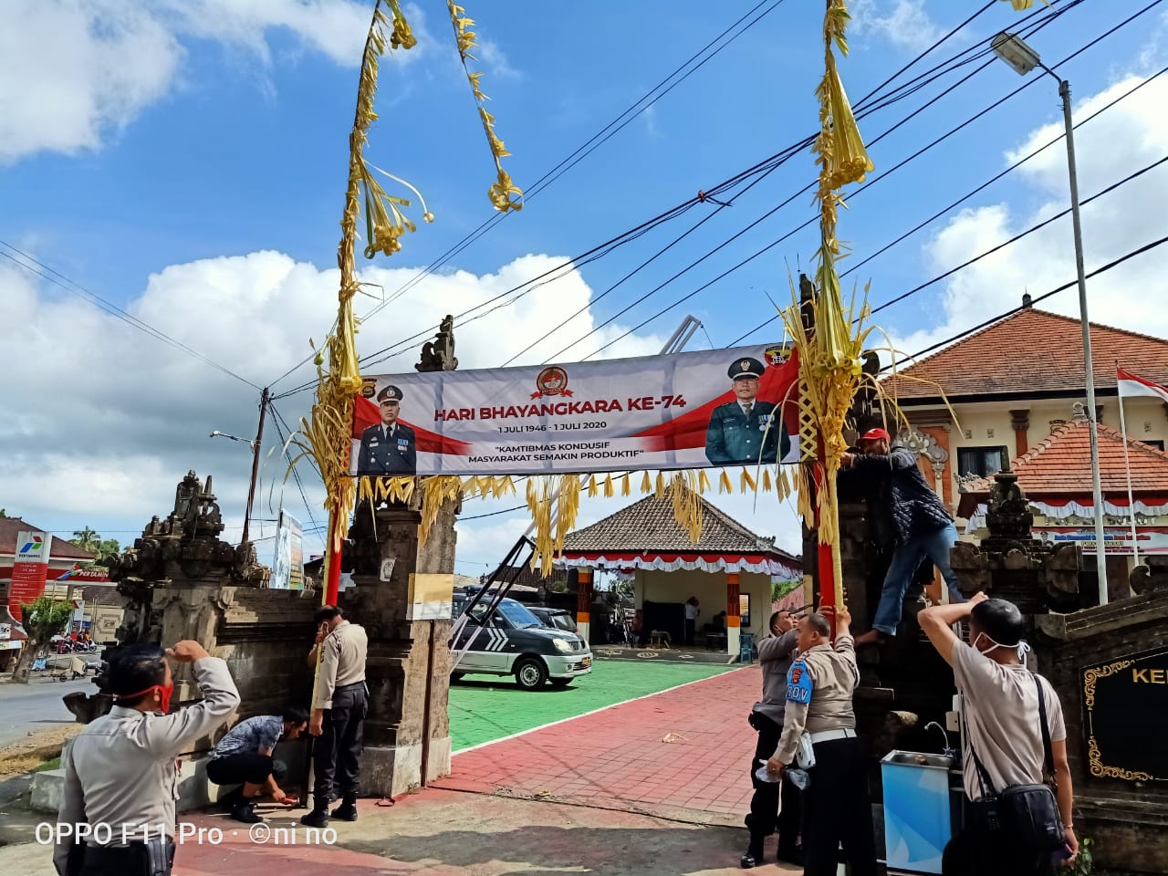 TargetNusa | Bangli – Meriahkan Hari Bhayangkara Ke-74 anggota Polsek Susut menghias Kantor dengan pemasangan ider – ider, umbul – umbul, penjor dan spanduk.