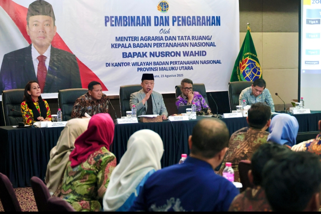 Menteri Agraria dan Tata Ruang/Kepala Badan Pertanahan Nasional (ATR/BPN), Nusron Wahid, memberikan pembinaan kepada jajaran Kantor Wilayah (Kanwil) BPN Provinsi Maluku Utara, di Kota Ternate, Sabtu (23/08/2025). Dalam arahannya, ia menekankan pentingnya jalur pengembangan karier (career path) dan motivasi kerja bagi seluruh jajaran, terutama generasi muda, agar semangat transformasi kelembagaan dapat terus terjaga.