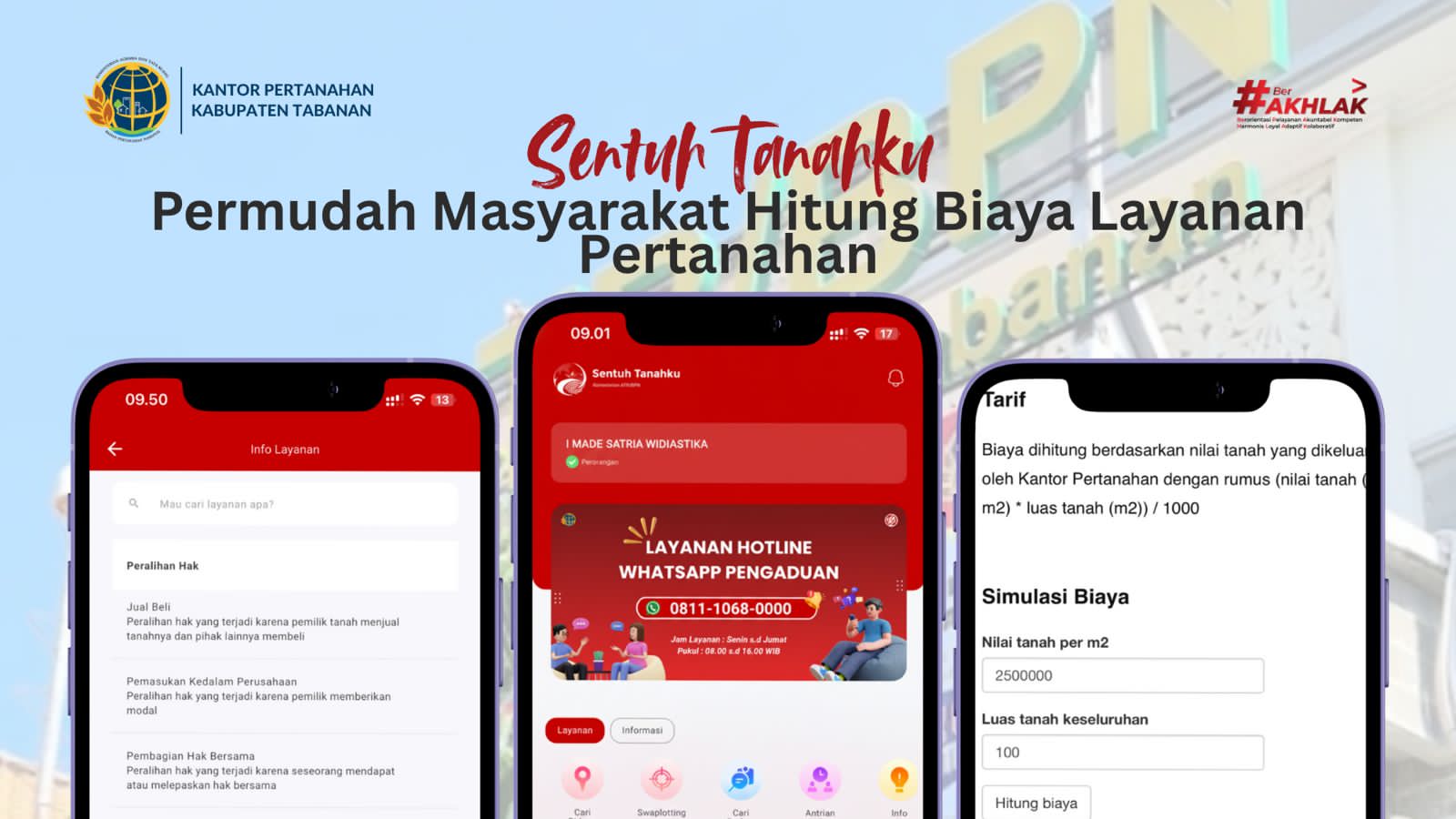Kantor Pertanahan Kabupaten Tabanan terus mendukung transparansi pelayanan publik melalui pemanfaatan aplikasi Sentuh Tanahku. Kini, masyarakat tidak perlu lagi bingung menghitung biaya saat hendak mengurus dokumen pertanahan.