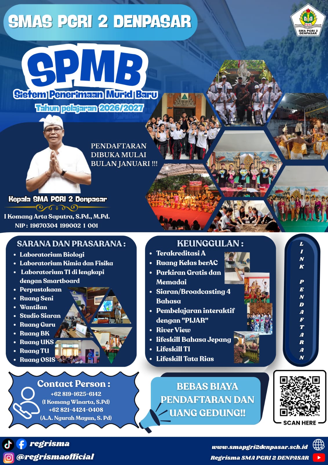 Ia juga mengatakan pendaftaran untuk SMA PGRI 2 DENPASAR kini lebih fleksibel, memudahkan calon siswa untuk mendaftar secara online melalui QR Code atau datang langsung ke sekolah.